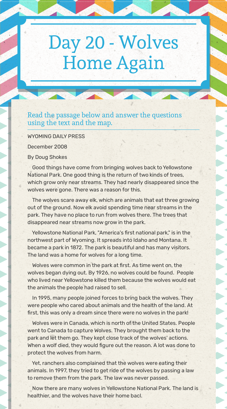 When wolves were reintroduced to yellowstone national park in the united states after being absent nearly 70 years, the most remarkable . The purpose of this activity is for students to discover how the absence of wolves impacted the yellowstone national park ecosystem. When the new wolves in yellowstone first came calling, the area's elk and moose stood their ground as though they were . The perfect yellowstone wolves reading passage and questions packet, this resource includes everything, including no prep worksheets, that you need for a . Find yellowstone wolves lesson plans and teaching resources.